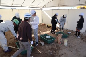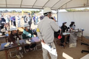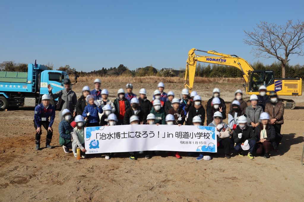 2026年1月15日 地元の明道小学校の生徒を大岩田遊水地の現場に招待し【「治水博士になろう!」in明道小学校】のイベントを実施しました。 ICTの重機説明や、小型重機の体験、消波ブロックのミニチュア作成と模型で効果実験、生コン練り体験など、盛りだくさんで体験していただきました。 市役所や国土交通省などの方々も同席いただき、子どもたちの体験の様子を一緒に見守っていただきました。 これからも地域と共に未来の建設業を支える活動をしていきます。 【見学の様子】