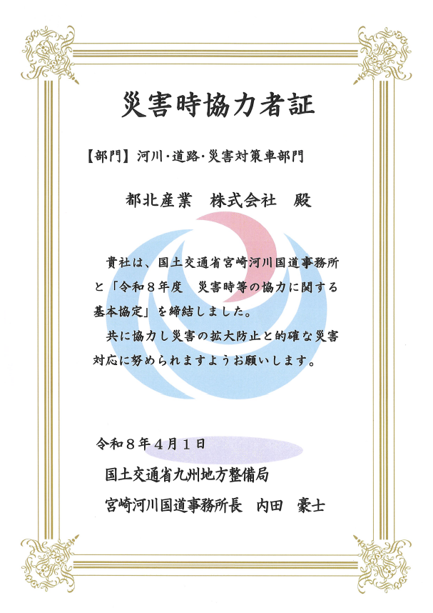 国土交通省宮崎河川国道事務所から委託を受け、災害発生時に復旧作業を担う企業に協力者証が交付されました。 災害時協力者証